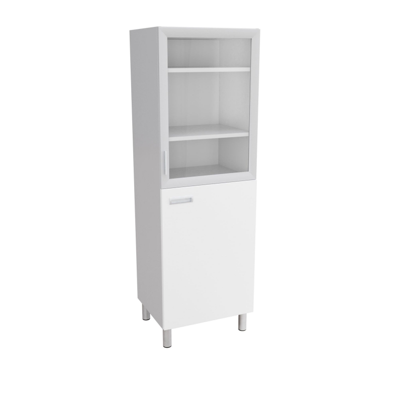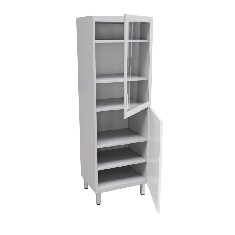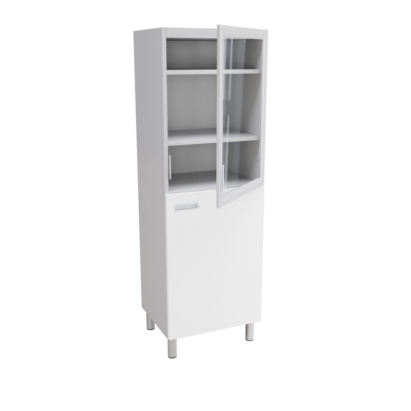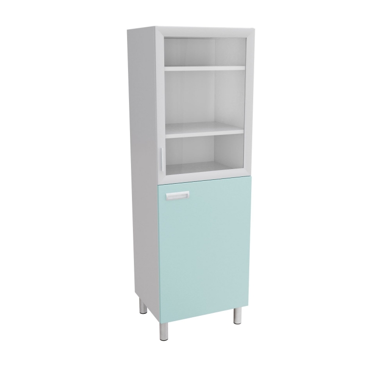 - Нижняя секция имеет металлическую дверь с накладными петлями с доводчиком, угол открывания 160°. Полки металлические устанавливаются на универсальные металлические пластинчатые полкодержатели.