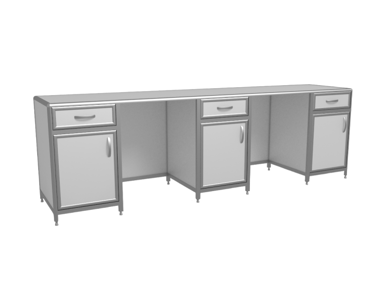 Стол лабораторный трёхтумбовый СЛ 3-02 с каркасом из анодированного алюминиевого профиля. Столешница выполнена из МДФ 16мм и покрыта слоем пластика. Наполнение каркаса выполняется в двух вариантах: Пластик - 3 мм. ЛДСП - 8 мм. Стол имеет три тумбы. Все три тумбы оснащены одним выдвижным ящиком на роликовых направляющих и дверкой с одной полкой посередине. Опоры стола регулируются по высоте. Ширина рабочих мест - 715мм. Ширина тумб - 415мм. Паспорт изделия