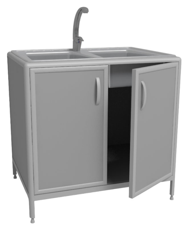 Две распашные дверки. Сверху две мойки из нержавеющей стали.
