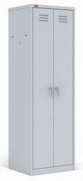 Шкаф двухсекционный с двумя отделениями, в каждом отделении: съемная полка для головного убора, перекладина для вешалки и крючки для одежды.