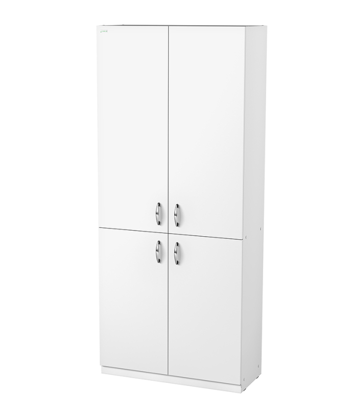 Шкаф разделен на 2 секции: в верхней секции расположены 2 съемные полки из ЛДСП, в нижней секции – 1 съемная полка из ЛДСП. Каждая из секций закрывается индивидуально 2-мя дверьми из ЛДСП.