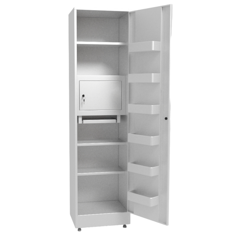 - Шкаф для медикаментов одностворчатый имеет одну запираемую металлическую дверку.
