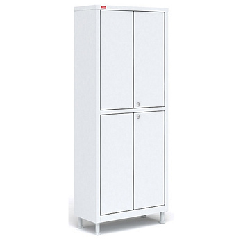 - Шкаф имеет 2 отделения, за 4 распашными дверками. В каждом отделение имеется по две металлические полки.