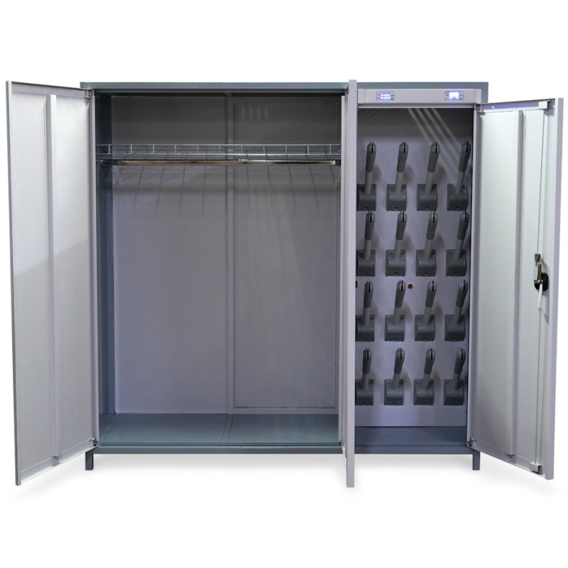 - Шкаф представляет собой металлический корпус, имеющий рамную конструкцию. Корпус разделен по ширине на отделение для сушки одежды с двумя дверьми, закрывающимися ригельным замком, и отделение для сушки обуви также закрывающееся ригельным замком. В задней части отделения для обуви встроен блок нагрева, нагнетающий теплый воздух как в отделение для одежды, так и в отделение для обуви.