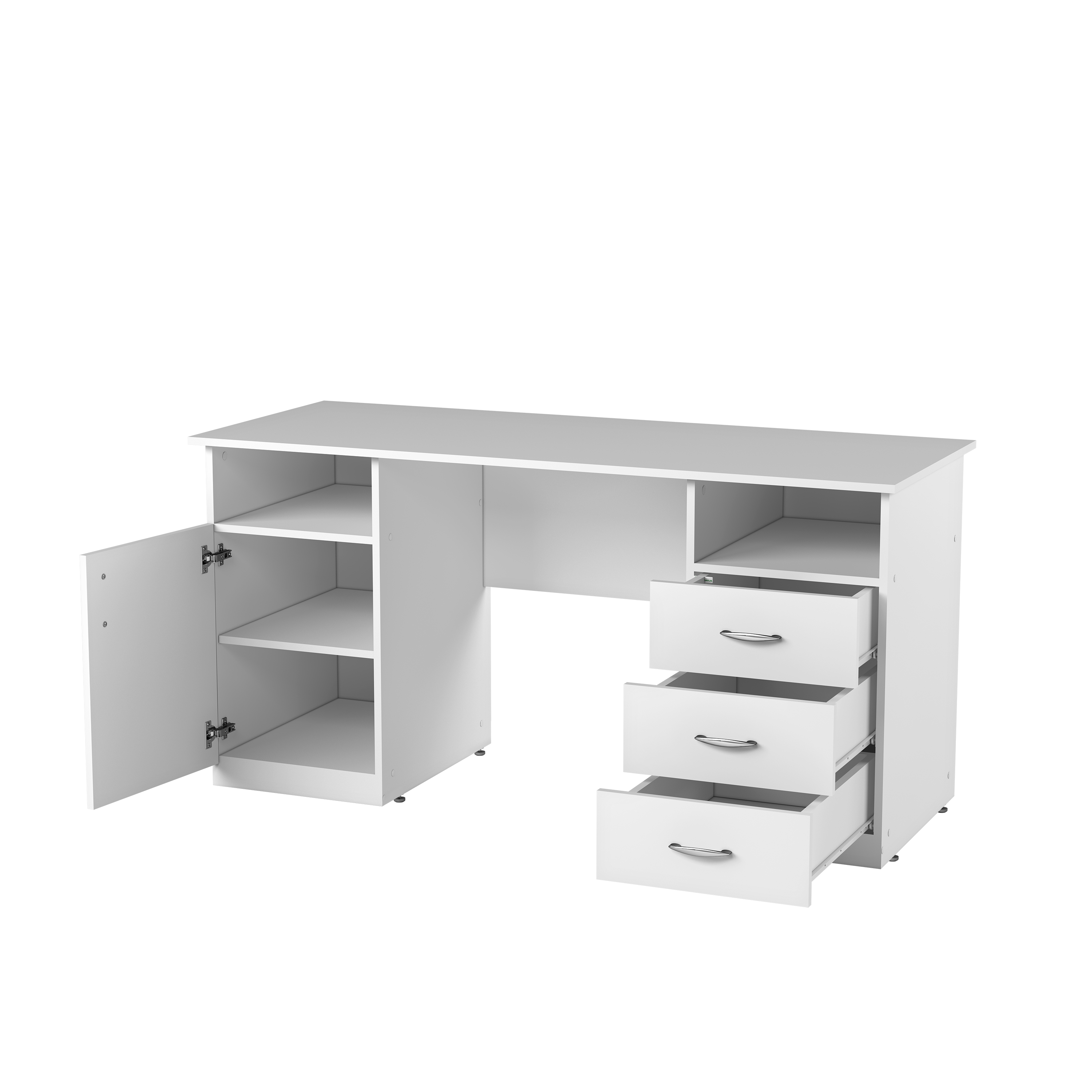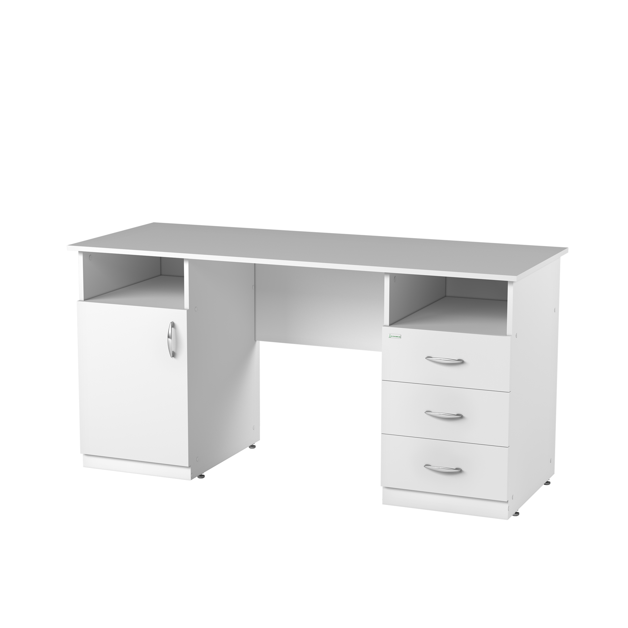 Стол оборудован двумя боковыми тумбами. Одна тумба оснащена нишей и отделением с дверкой и полкой внутри. Вторая тумба имеет нишу и три выдвижных ящика.