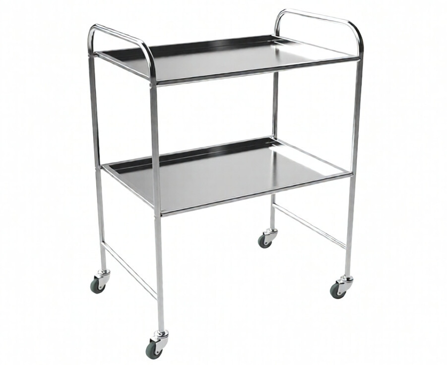 - Столик имеет 2 съемные полки из нержавеющей стали размером 627x448 мм с бортиками 20 мм по всему периметру