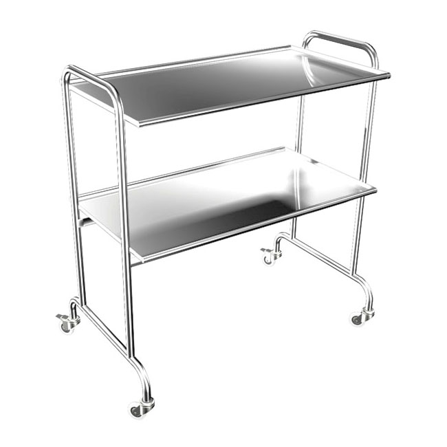 - столик имеет 2 вынимающиеся полки из листовой нержавеющей стали 0,8 мм с бортиками 16 мм, размеры – 755 x 395 мм.