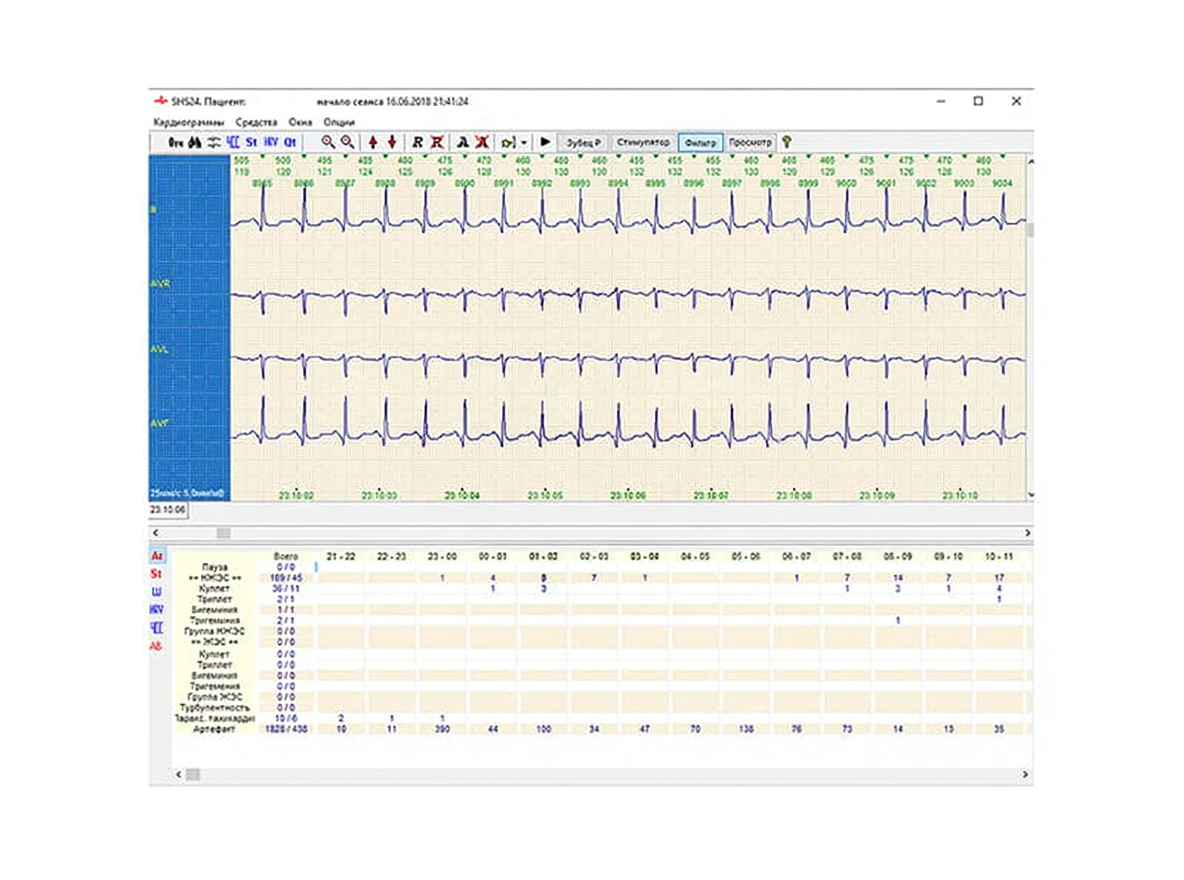 - Программный модуль суточного мониторирования ЭКГ SHS-24h позволяет просмотреть записанную в памяти регистратора ЭКГ пациента, провести анализ ЭКГ, выполнить необходимое редактирование и получить протокол обследования, а также архивировать полученные результаты и распечатать отчет с данными пациента