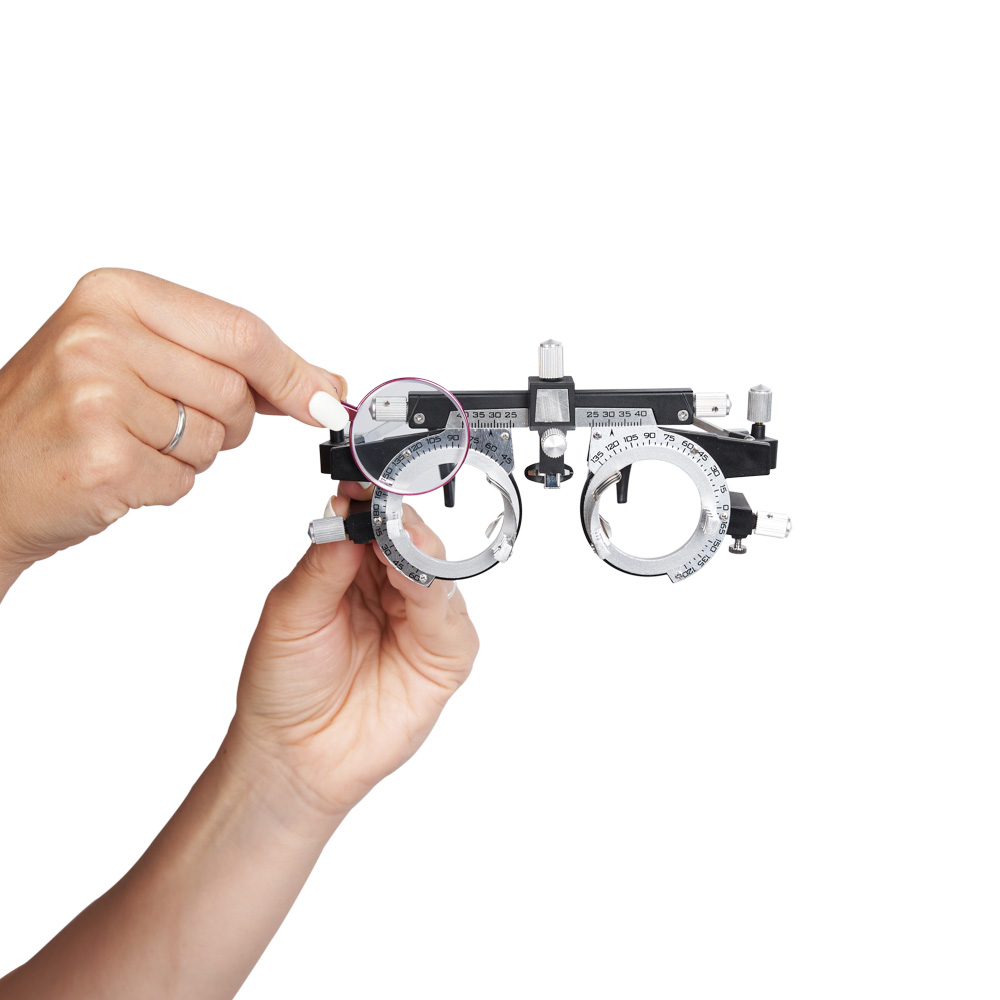 - Универсальная пробная оправа (150x95x45 мм) регулируется с помощью шарнирных винтов и подходит для проверки зрения у пользователей с различной формой и размером головы. Два зажима оправы удерживают до 4 линз каждый, позволяя точно выбрать подходящую диоптрию. Регулировка оправы даёт возможность изменять ось цилиндрических и призматических линз и межзрачковое расстояние, а также найти удобное положение подушки для носа