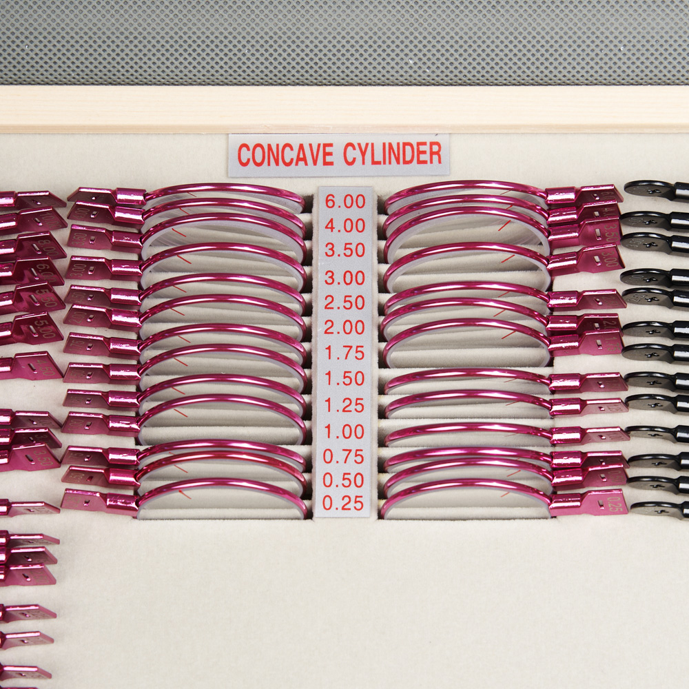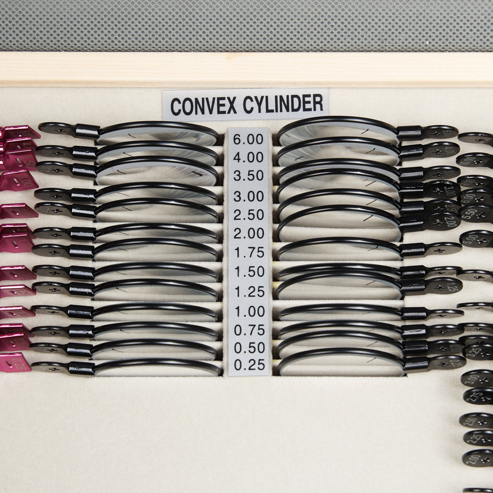 - На рукоятку нанесено номинальное значение оптической силы линзы, на ободках астигматических линз — направление главного сечения нулевого действия линзы/призмы, на рукоятках дополнительных элементов — условное обозначение