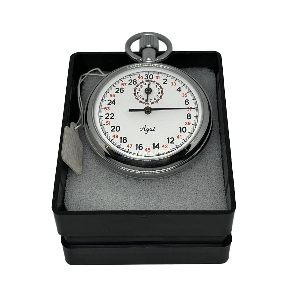 - Модель оснащена 30-секундной шкалой с ценой деления 0,1 сек. и 15-минутным счетчиком с ценой деления 1 мин. Высокая точность измерений обеспечивается за счет оснащения колебательной системой «баланс-спираль», обычно используемой в карманных часах, с периодом колебания 0,4 секунды. Продолжительность работы механизма после полного завода пружины составляет не менее 18 часов.