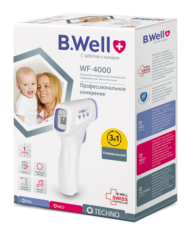 Термометр медицинский электронный инфракрасный B.WELL WF-4000 предназначен для бесконтактных измерений температуры тела, окружающей среды и предметов. Область применения: термометры инфракрасные предназначены для индивидуального применения, а также могут быть использованы в медицинских учреждениях и в службах оказания медицинской помощи на дому. Принцип работы термометра основан на измерении инфракрасного излучения, которую излучает поверхность тела человека или предмета, преобразовывая в температурное значение.