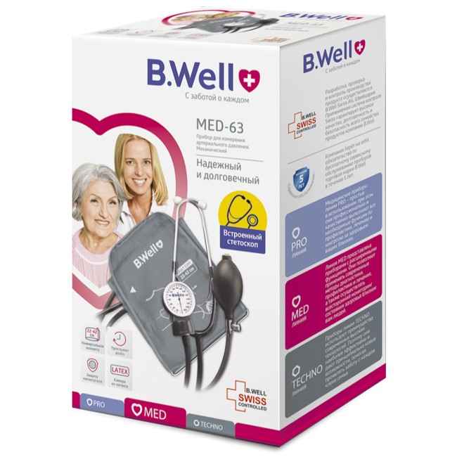 B.Well MED-63 — удобный механический тонометр со стетоскопом в комплекте. Благодаря встроенному стетоскопу и манжете с кольцом MED-63 подходит даже для самостоятельного контроля давления. Точный и надежный тонометр B.Well MED-63 имеет манометр с металлическим корпусом и удобной шкалой. Манжета для руки с обхватом 22–42 см отличается комфортом и надежностью, сделана из плотного нейлона с окантовкой края, имеет удлиненную застежку для прочной фиксации и эргономичный скругленный край для удобного надевания. Камера манжеты выполнена из латекса по бесшовной технологии. Нагнетатель позволяет комфортно накачать манжету и плавно выпустить воздух. Механический тонометр MED-63 надежен и долговечен, он подойдет для профессионального применения, но будет особенно удобен для домашней аптечки.