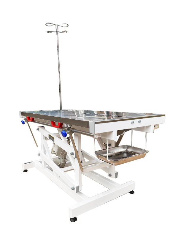 - Стол оснащен электроподъемником (максимальная высота 1100 мм, минимальная 600мм), крючками для фиксации животного, хирургическим лотком, штативом для капельниц.
